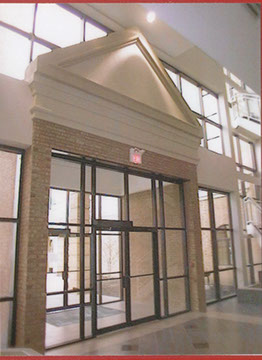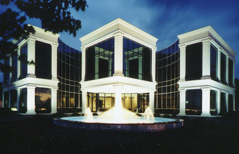 A design build project, the two‑story structure utilizes architectural precast panels to imitate limestone columns and cornice. Indian Black granite and green mirrored glass served as infill between the columns. Original budgets were altered as the owner added expensive finishes to the interior. Granite and marble flooring, large crown moulding and casework, and exotic wallpaper give this Class AAA office space an elegant touch. A large twenty‑four feet diameter fountain, an interior fountain, and a circular drive add to the effect.