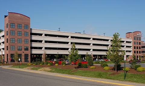 This 530‑car structure utilizes pre-cast concrete load‑bearing columns, spandrel panels, and double tees. Split‑faced masonry provides an accent at two corners of the structure. The towers house a total of two stairs and two elevators. A storage room is also provided at each level.